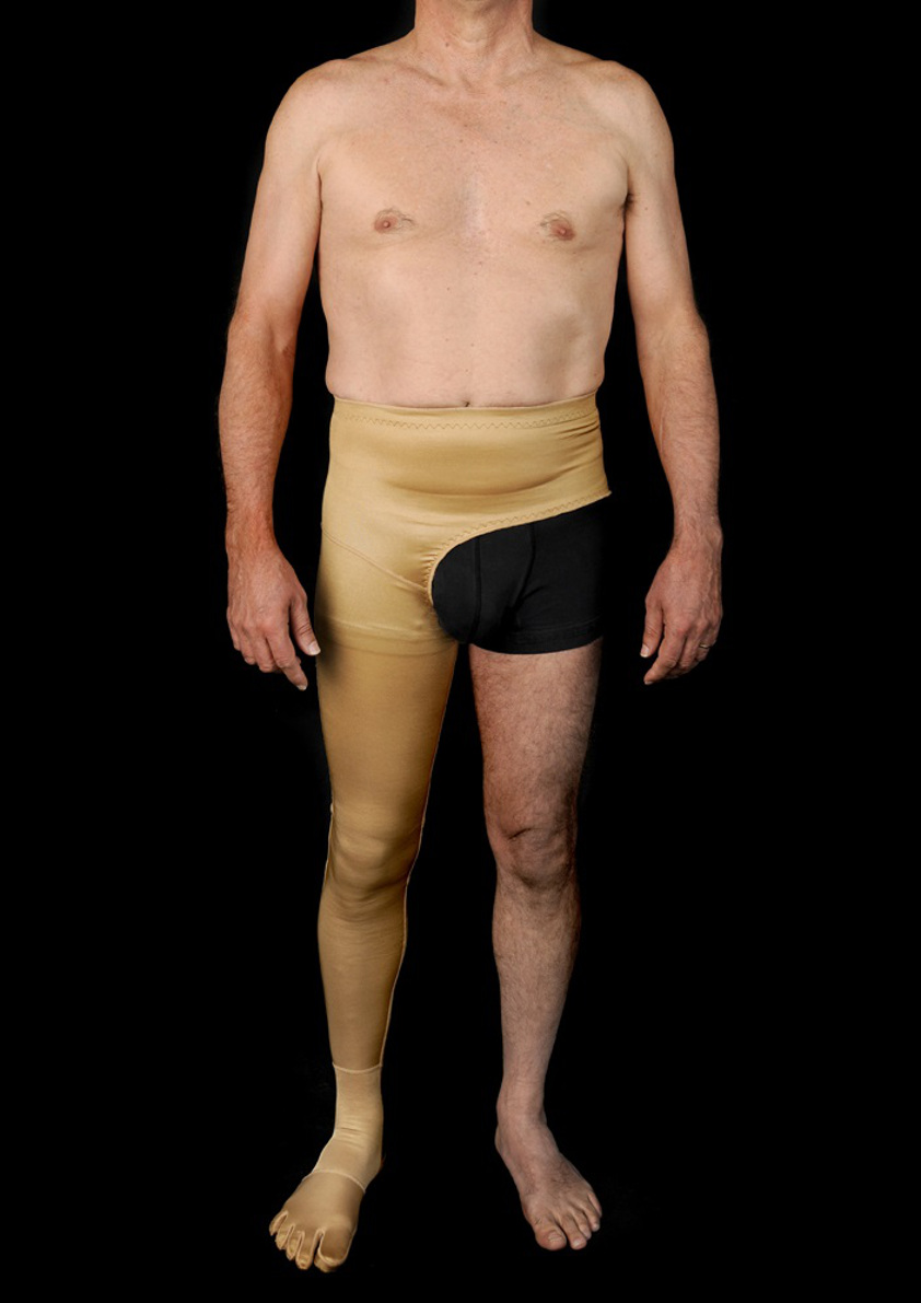 Second Skin custom made tights or panty girdles are worn as a consequence of burns, traumatic injuries, lymphoedema, venous insufficiency, amputations and chronic oedema of the lower trunk, genital area and lower limbs.